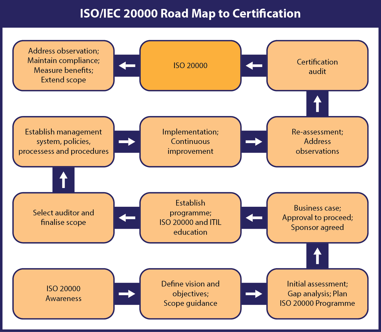 Our proven roadmap, shown here, provides clients with a clear strategy of how best to approach an ISO 20000 project, with 1WorldVerify.com able to guide them on a successfully journey and in the most effective manner.